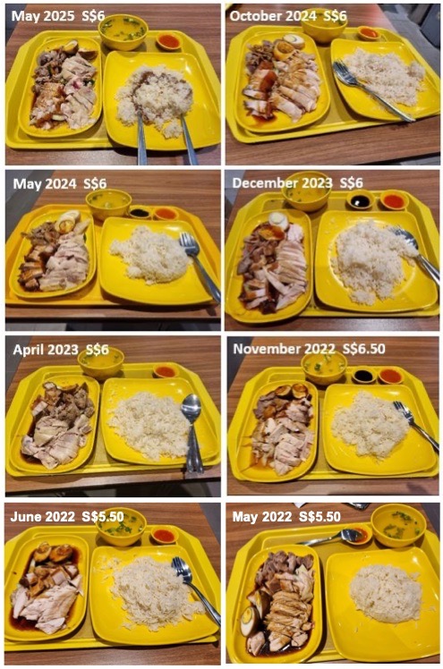 In May 2022, the cost of a chicken rice set at the Market Street Hawker Centre, consisting of steamed chicken, roast pork, gizzard and an egg, cost me S$5.50.