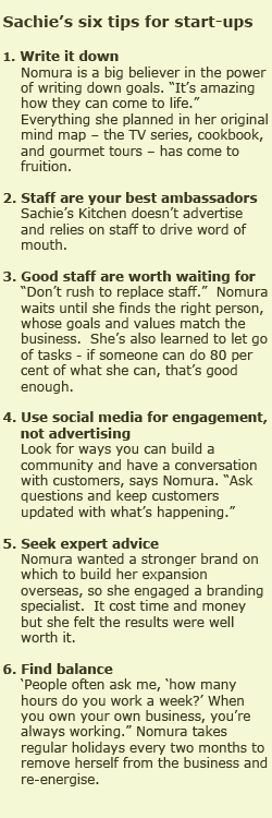 Proudly framed on the wall near the entrance is a scrap of paper with a mind map sketched on it in felt pen. “Sachie’s Kitchen” is in the centre, with ‘cook school’ ‘TV show’ and ‘gourmet tours’ coming off it in colourful little bubbles.