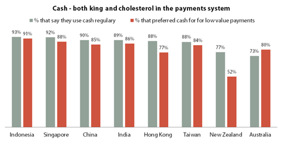We now believe the actual battle ground for cash will occur in low-value payments – newspapers, drinks, takeaway meals etc. Across Asia-Pacific, 80 per cent of consumers say they actually prefer to use cash over other payment options when it comes to low-value purchases.