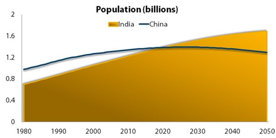 India has a large labour endowment and huge potential gains in productivity to be made. It will overtake China in terms of population by 2020 and in terms of economically active population in 2040. Unlike China, India’s economically active population will not peak over the forecast period. Indeed, India has a demographic endowment that will significantly exceed China’s and therefore has enormous potential to industrialise as the world’s manufacturing base and services hub given this huge demographic dividend.