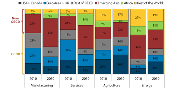 Emerging Asia in general will have a significant role to play in global manufacturing. While currently accounting for 29 per cent of manufacturing, it will account for 43 per cent in 2060. However, its contribution to energy will decline from 37 per cent to 29 per cent while the USA and Canada’s share is forecast to increase. Emerging Asia will also capitalise on a burgeoning services sector, contributing an additional 15 percentage points of global services production in 2060.