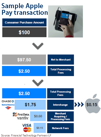Yet that ignores the fact it can make sense to sacrifice revenue per transaction if there is greater overall volume – that is, unit revenue is lower but total revenue higher.” . Presumably those institutions which have struck a deal with Apple, and they include Wells Fargo, Citi, American Express, Visa, MasterCard and dozens of others, believe access to Apple’s 800 million plus customer base justifies paying out a reported 15 basis points per transaction.