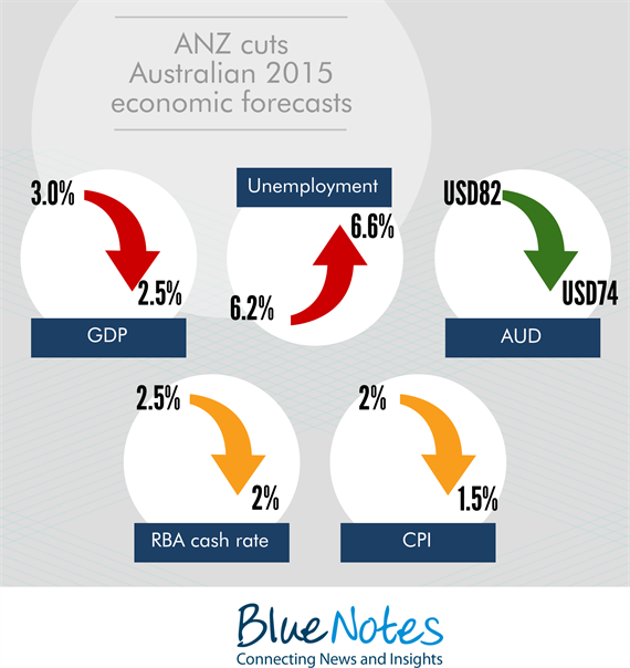 ANZ has lowered its growth forecast for the Australian economy and have now factored in two 25 basis point rate cuts over the first half of 2015.