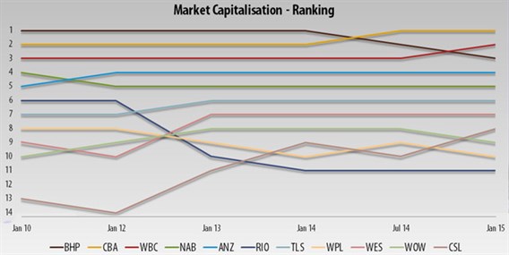 The long-time standard bearer of the ASX, BHP Billiton, the world’s biggest miner, has slipped to three. Indeed resource-related stocks as a group have slipped down the rankings as commodity prices - bulk commodities initially and now oil and copper too – have collapsed.