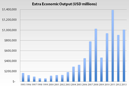 An extra trillion makes a big difference not only to China but also to its trading partners. A trillion US dollars is worth more than half the Australian economy. Each time China expands, so does its capacity to drag the Australian and New Zealand economies along with it.