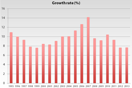 In 2014 a year of sub-8 per cent growth added one trillion US dollars worth of output to the Chinese economy.