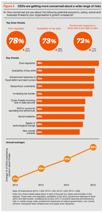 Businesses are increasingly finding it difficult to secure people with the skills they need to grow. Three quarters of the 1,300 CEOs interviewed for the survey rank skills shortages as the biggest threat to their business growth. This represents a 10 percentage point jump from 2014 and is up from less than half (46 per cent) six years ago.