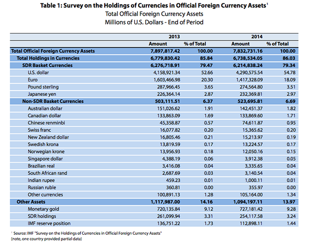 Interestingly, according to an IMF survey conducted earlier this year, during 2014 central bank RMB reserves increased from $US45.4 billion to $US74.6 billion (64 per cent growth) which was the largest dollar-value increase in any currency aside from the USD .