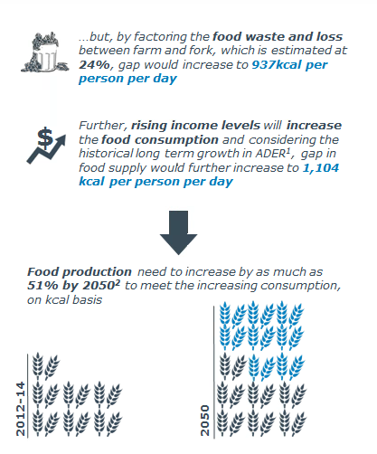 - Further, rising income levels will increase food consumption and considering the historical long term growth in ADER, the gap in food supply would further increase to 1,104 kcal per person per day.