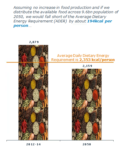- Assuming no increase in food production and we distribute the available food across 9.6 billion people in 2050, we would fall short of the Average Dietary Energy Requirement (ADER) by about 194kcal per person.