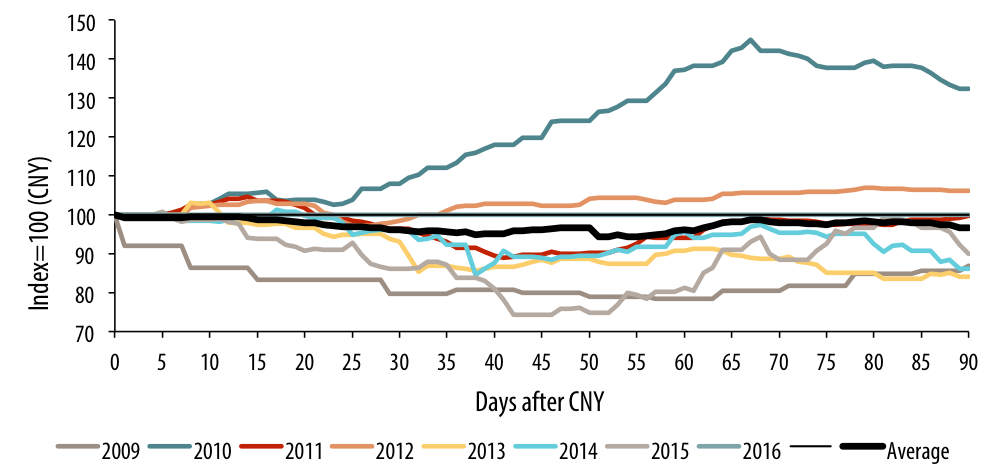 Therefore, it should not come as a surprise prices have continually disappointed post New Year. Outside of 2010, iron ore prices have fallen every year one month after the Chinese New Year. And in all cases bar 2010 and 2012, prices have still been lower than before the Chinese New Year some 90 days later.