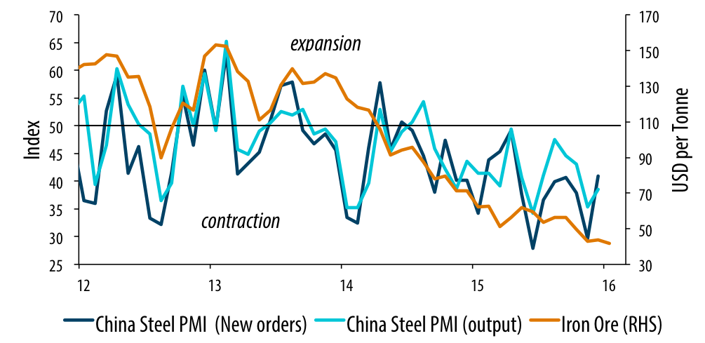 This continues to be reflected in the Chinese steel PMI. While it recorded a small gain in December 2015, it presently remains in contracting territory at 40.6. The new order and output subsectors also remain weak, with both well below 50.