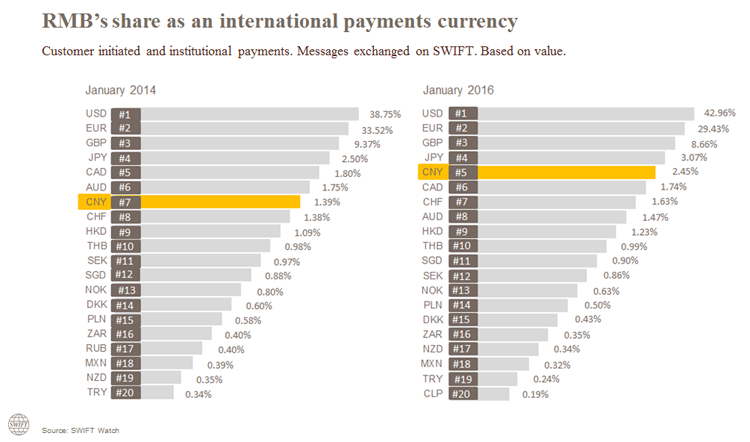 According to SWIFT, in January 2016, the RMB was the fifth most active currency for global payments by value and accounted for 2.45 per cent of global payments, a slight increase from 2.31 per cent in December 2015. Its activity share is higher than last month even though RMB payments decreased by 5.7 per cent in value, while at a global level, all currencies decreased by 11.2 per cent in value over the same period.