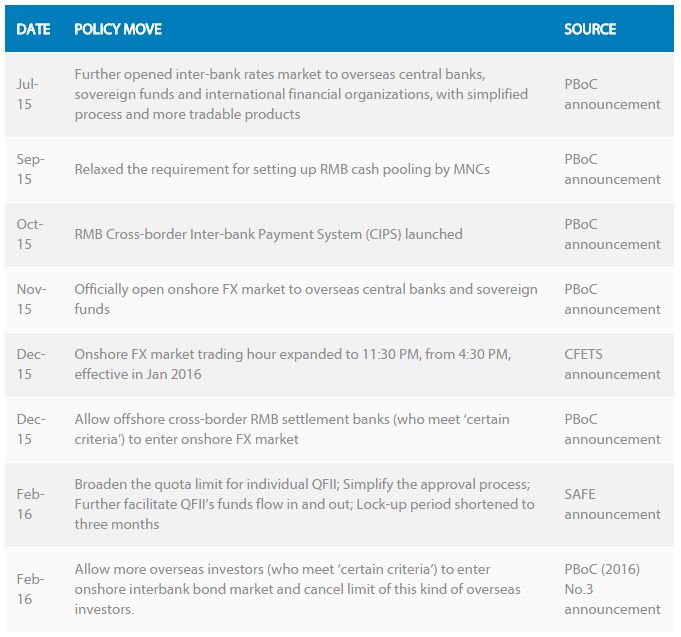 Take two key examples: the RMB is increasingly important in regional trade flows while the Chinese central bank, the People's Bank of China, has just made it easier for foreign issuers of debt and foreign investors to participate in the Chinese bond market.
