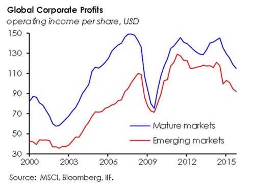 “The Japanese corporate sector, having enjoyed strong profitability in recent years after the launch of Abenomics, saw a decline in profits in Q4. For the corporate sector in many emerging markets, the trend has been worse: for the aggregate MSCI EM index, earnings have declined on a quarterly basis since mid-2014."
