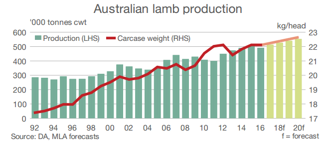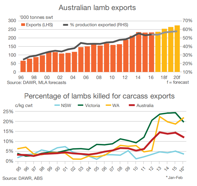 According to the latest Meat & Livestock Australia Sheep Industry projections, Australian lamb exports in 2016 are forecast to be fairly steady with the past two years, at 235,000 tonnes shipped weight, before gradually growing with production to 280,000 tonnes shipped weight (swt) by 2020.