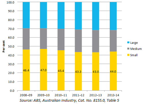 According to the Australian Bureau of Statistics, small business accounts for the largest share of total employment in Australia (by firm size) at 44.0 per cent. Medium businesses make up a further 24.3 per cent.