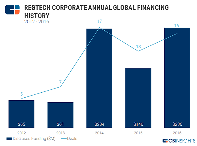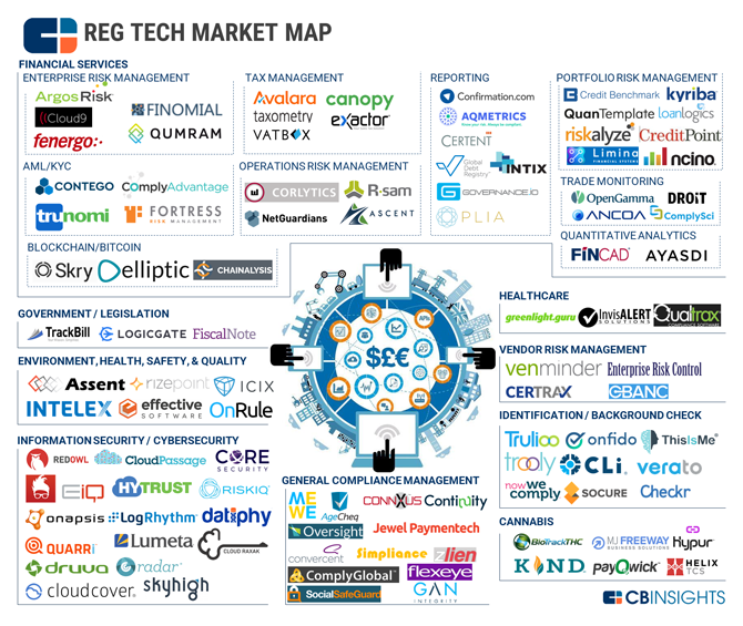 “A host of tech start-ups in the regulatory space has emerged that offer a range of software, services, and tools aimed at bringing more data and efficiency to regulatory compliance,” CB Insights noted.