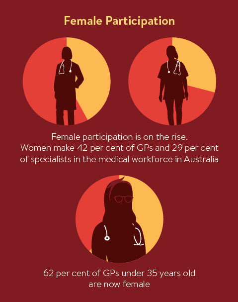 However, female GPs earn around 25 per cent less than males after accounting for differences in hours worked and female GPs’ careers are more disrupted by having children, in terms of reduced workforce participation.