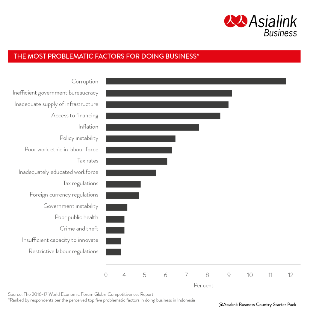 Corruption was recognised as the most problematic factor for doing business in Indonesia in the 2016-17 World Economic Forum Global Competitiveness Report.