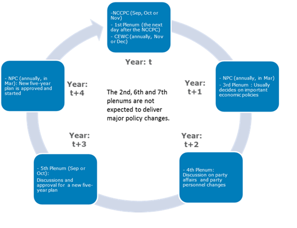The NCCPC is held every five years, followed by seven plenary sessions (‘plenum’). The NCCPC ‘elects’ the Party’s General Secretary and decides on important economic strategies which are usually presented at the third plenum one year later.