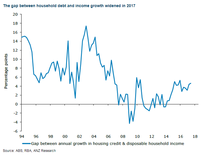 Household debt in Australia is still growing faster than household income, putting upward pressure on the already high household debt-to-income ratio. The gap between debt and income growth has widened this year despite policy moves.