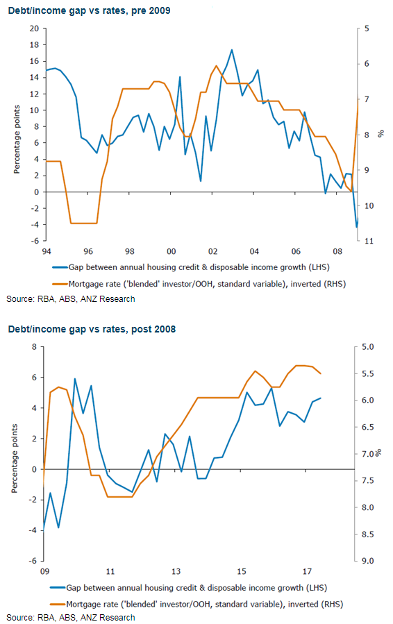 To get a better feel for the importance of interest rates, we need to take into account what appears to be a structural break in the relationship between the debt/income gap and mortgage rates around the time of the GFC. The two charts below split the data into the periods up to the end of 2008 and then from 2009.