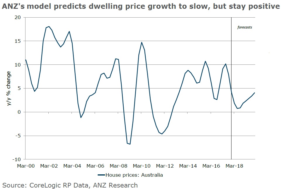 House-price growth will trough at around 1 per cent year on year in the second quarter of 2018 according to a new ANZ Research model, before bouncing back to around 2 per cent for the year as a whole – still down from the 4.2 per cent growth seen in 2017.