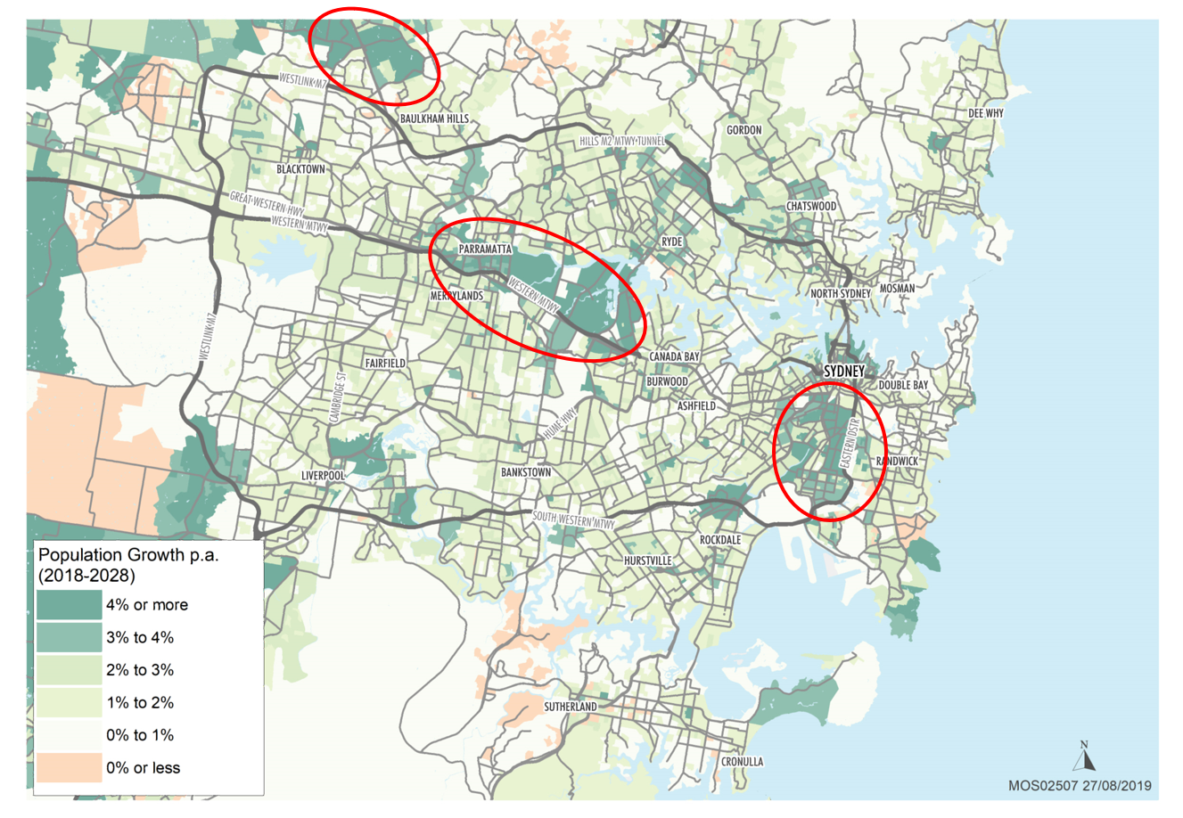 Annual population growth of 4 per cent plus is forecast across three clusters, Northwest, Parramatta and Sydney CBD. Just as in many other parts of Australia, a larger proportion of Sydneysiders will be in the over 65 age cohort.