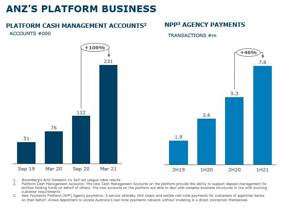 In the 2020 financial year, we increased the volume of payments and data processed through our digital channels to 1.3 billion transactions, up 19 per cent compared with the 2019 financial year. We have doubled the number of cash management accounts to 231,000 since the second half of the 2020 financial year, representing more than $A10 billion in deposits. And we have increased the number of NPP (New Payments Platform) payments for other banks by 115 per cent in the March 2021 half when compared with the March 2020 half.