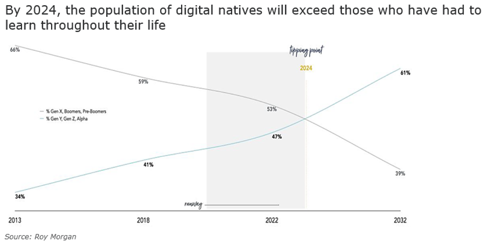 By 2024, the population of digital natives will exceed those who have had to learn throughout their life which means technology and digital will no longer be simply a component of society but part of its fabric.