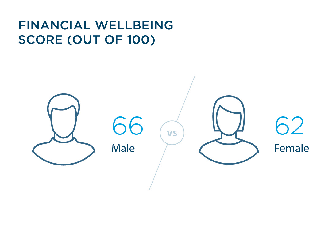 Australians have an average financial wellbeing score of 64 with men scoring higher (66 out of 100) than women (62 out of 100). Men generally scored above average on all four components of financial wellbeing and women scored below average for whether they were feeling comfortable about their financial situation, their financial resilience and their security for the future.