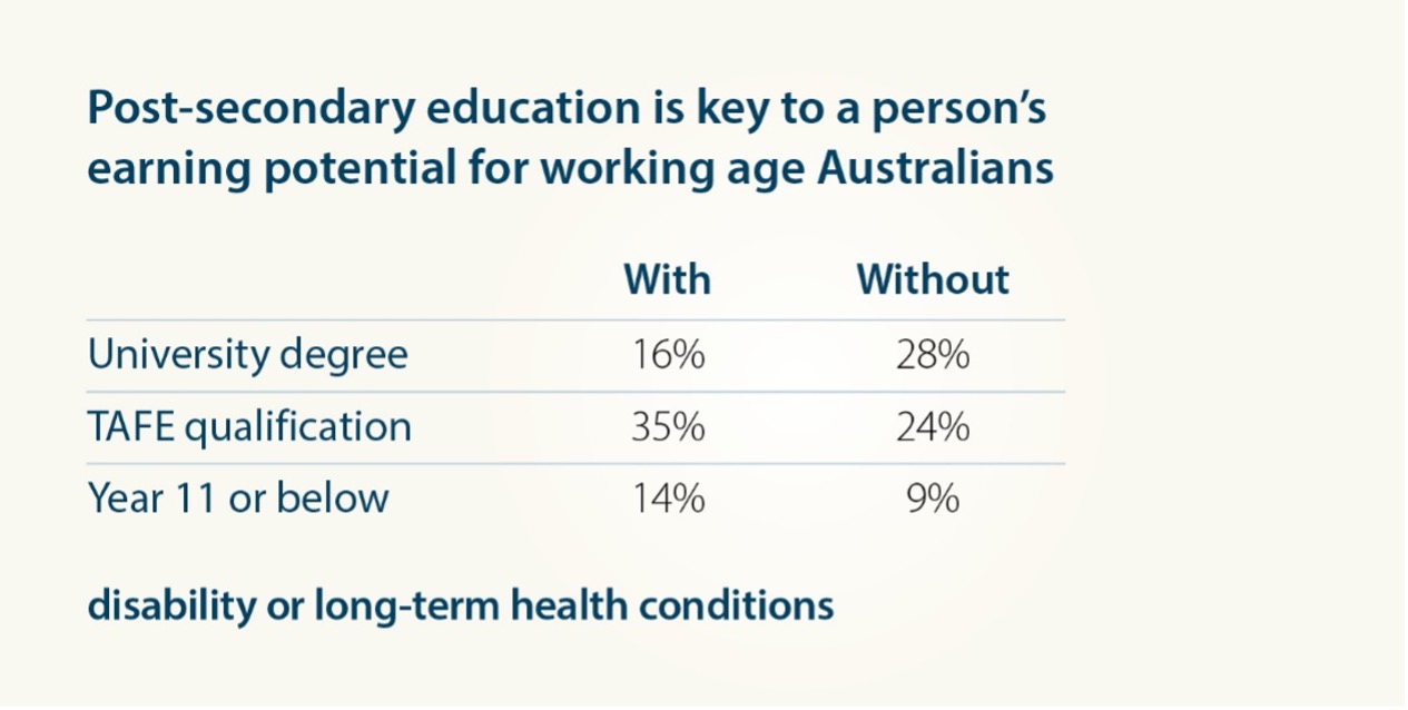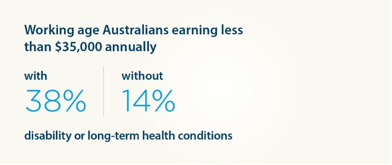 The findings from Financial wellbeing: people with disability or long-term health conditions demonstrated reduced earning potential and employment opportunities are particularly evident amongst working age Australians with disability or long-term health conditions.