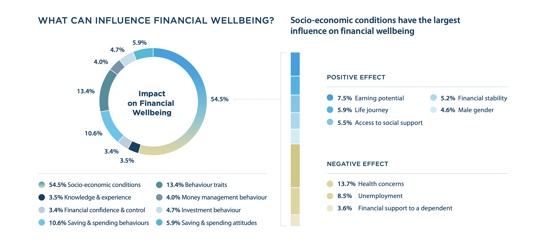 The 2021 Financial Wellbeing Survey showed in addition to health, unemployment, earning potential and life stage were the strongest socio-economic influences on financial wellbeing. Other socio-economic factors such as access to social support from family, friends and community, financial stability, gender and providing financial support to dependents were all significant influences on financial wellbeing.