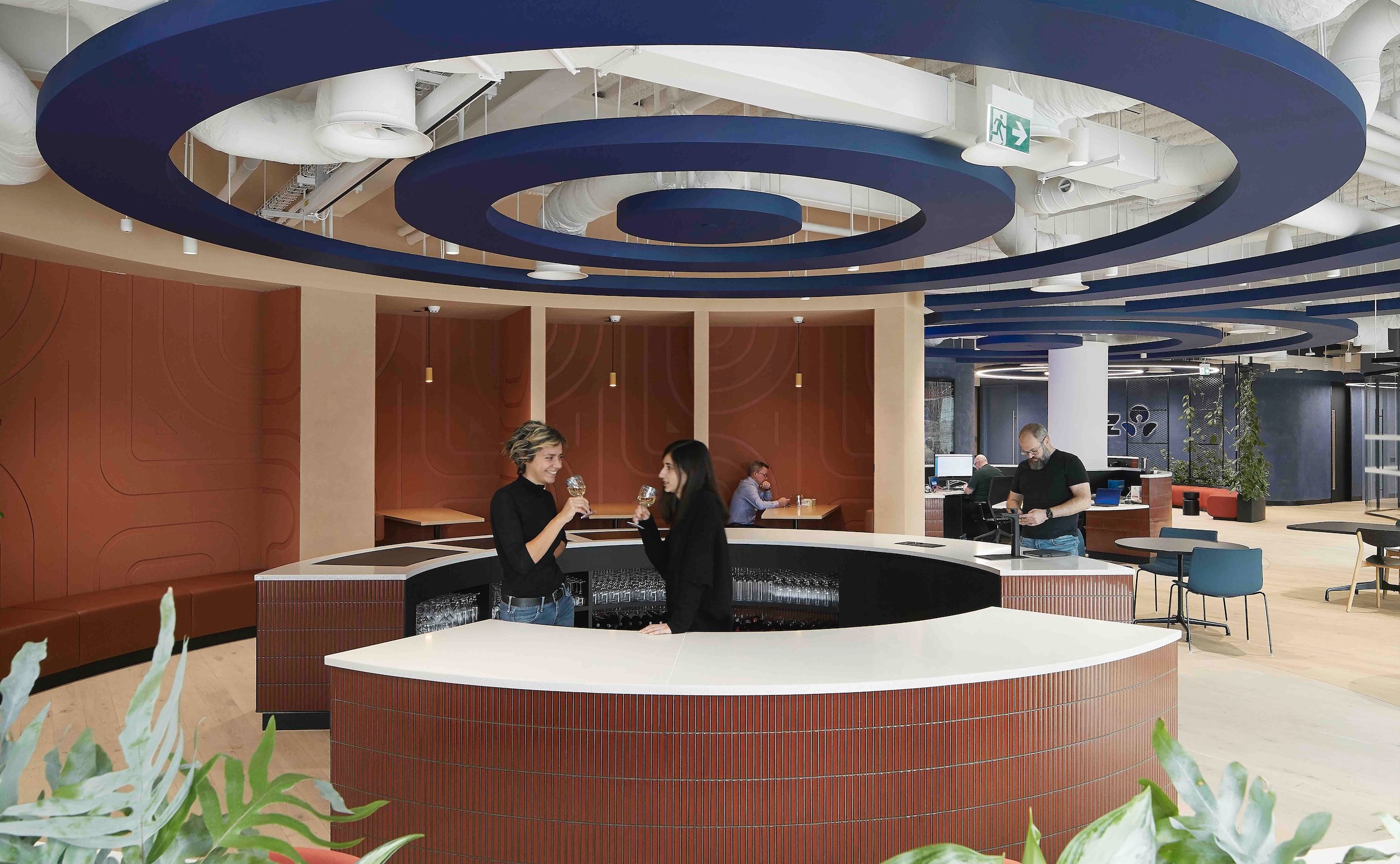 The fit-out was an opportunity to create open and transparent spaces that offer variety and flexibility, where function and purpose align to employees’ needs. The floorplate is arranged to create different zones of activity and a sense of journey across the whole office. Determining where key points of social interaction take place (reception, tech bar, central social counter etc), a symbolic drop falls at each of these points to create a ripple effect, radiating cross the floorplate, drawing on people’s energy. A variety of areas allows users to choose an environment best suited to their daily needs and feelings.