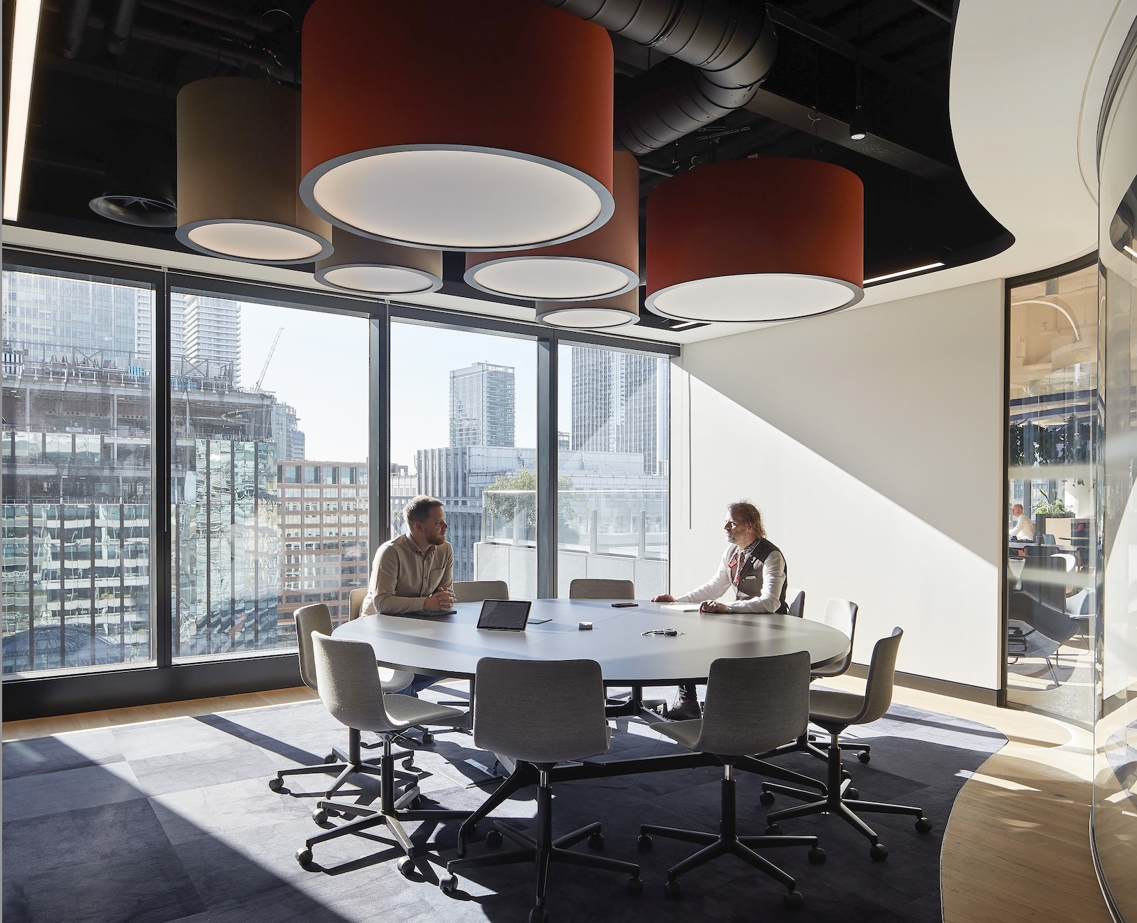The creation of these flexible spaces and the desire to meet users’ needs required a number of different furniture typologies. These included curved focus desks arranged in circles within the floorplate; touchdown, meeting room and social space tables; and fixed and sit-stand desks spread across the open space as well as desks within individual focus rooms. Different types of seating appropriate to the function of those different spaces have also been included such as task chairs, casual seating and lounge chairs, benches and stools.