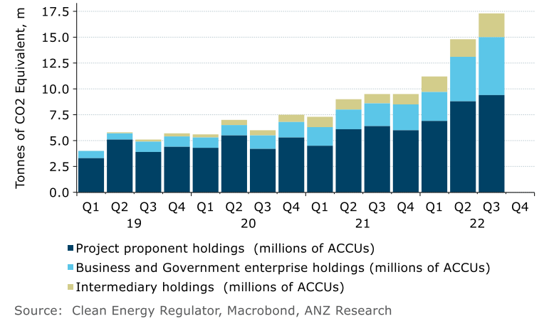 The September quarter 2022 saw a record amount of ACCU purchased by intermediaries (or investors). Approximately 600kt of ACCUs were added, bringing their total holdings to just over 2.25mt. After making up less than 1 per cent of the market in 2019, total holdings by investors have now increased to more than 13 per cent. Considering the surge in energy prices has been a big part of rising inflation, we expect investors to use the sector as a natural hedge.