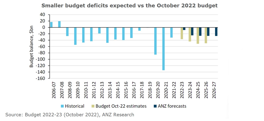 The budget deficit for 2022-23 is expected to run around $A8 billion, much smaller than the October 2022 estimate of a $A36.9 billion. There is a chance of a small, and likely temporary, surplus for 2022-23. Although ANZ Research expects Treasury will adopt a degree of conservatism in the estimates.