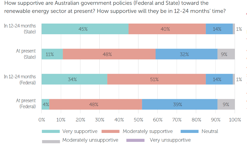 Investors expect government policies at state and federal levels to become more supportive over the next two years and 85 per cent of investors say federal and state policies will be supportive or very supportive towards renewables in 2023 and beyond.