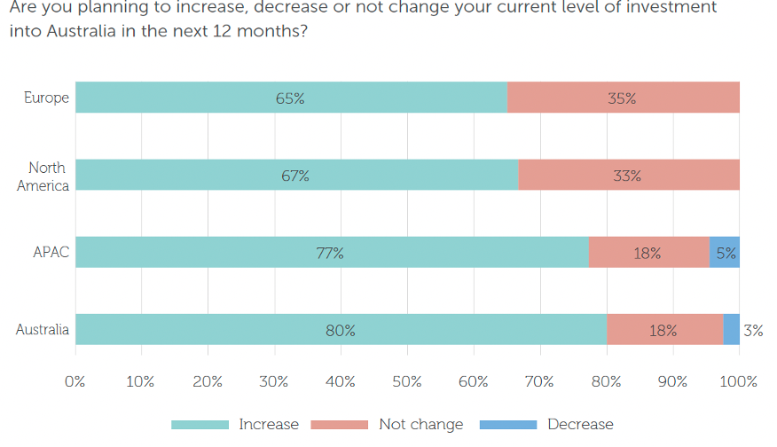 The research also finds 91 per cent of investors expect investment from Asia Pacific to increase in the next one to two years with Japan the most active investor. About 83 per cent nominated increased investment from Europe, while 57 per cent tipped increased investment from North America.