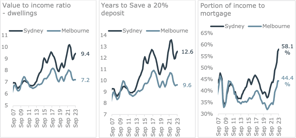 Quarterly housing affordability metrics – dwellings, Sydney and Melbourne
