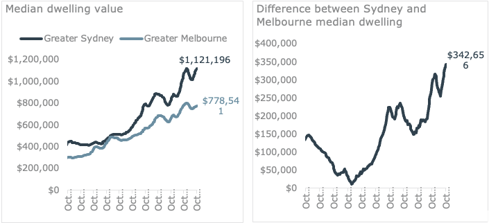 This would especially be the case for aspiring home owners, where the difference between the median house value in Sydney and Melbourne was $460,000 in October this year.