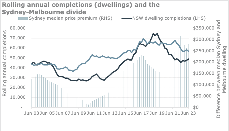 The more modest growth in Melbourne dwelling values compared to Sydney is due to relatively more supply in Victoria: about 850,000 dwelling were completed across Victoria in the 15 years to June 2023, 21 per cent higher than in New South Wales over the same period, according to ABS building activity data.