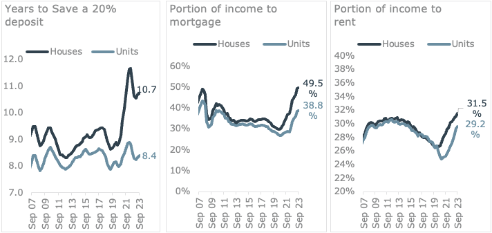 As a result, affordability metrics for units are much more in line with long-term averages, while house affordability has worsened considerably.