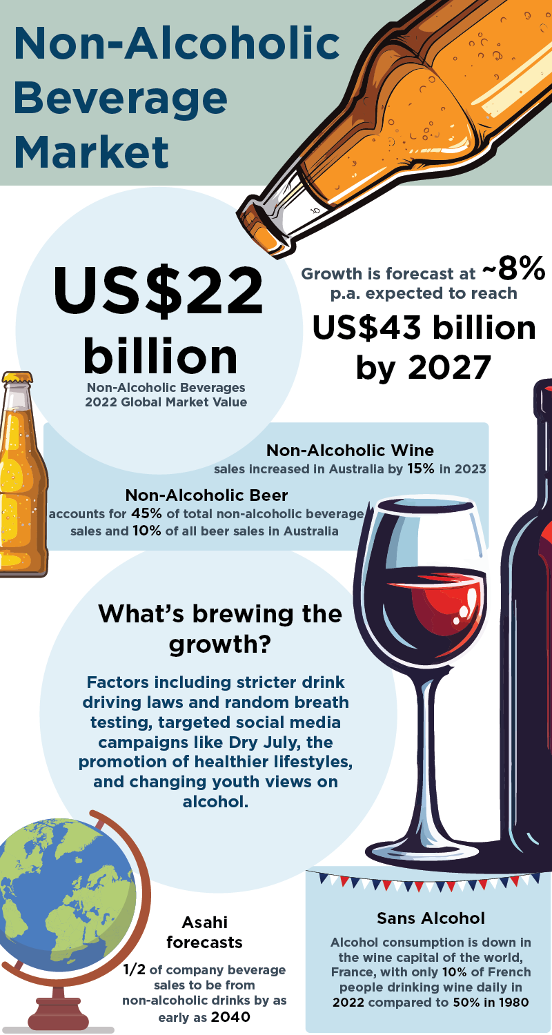 So what’s driving the growth in non-alcoholic beverages? For many older Australians, including my own generation, the concept of non-alcoholic wine or beer seemed inconceivable.