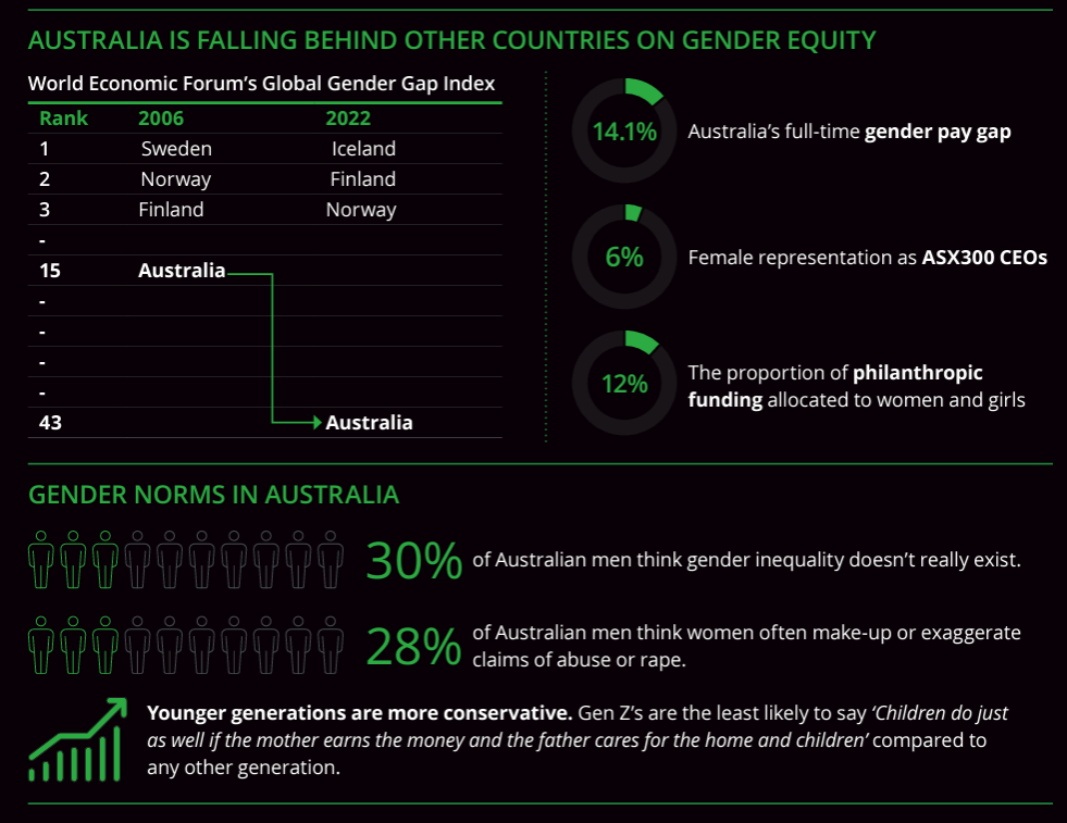 Australian men are more traditional in their gender attitudes than the global average, with 30 per cent of Australian men agreeing gender inequality doesn’t really exist. These rigid norms and stereotypes impact the physical and mental health of people of all genders and prevent us from reaching our full social and economic potential.
