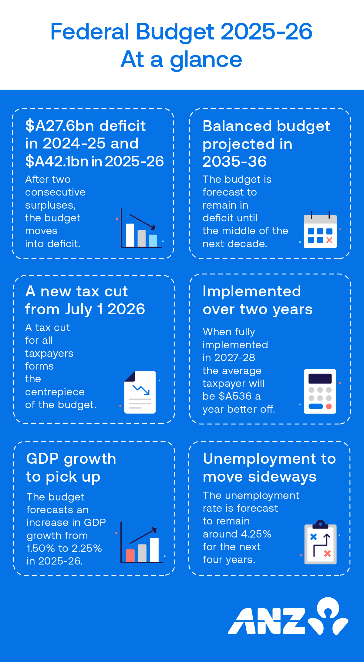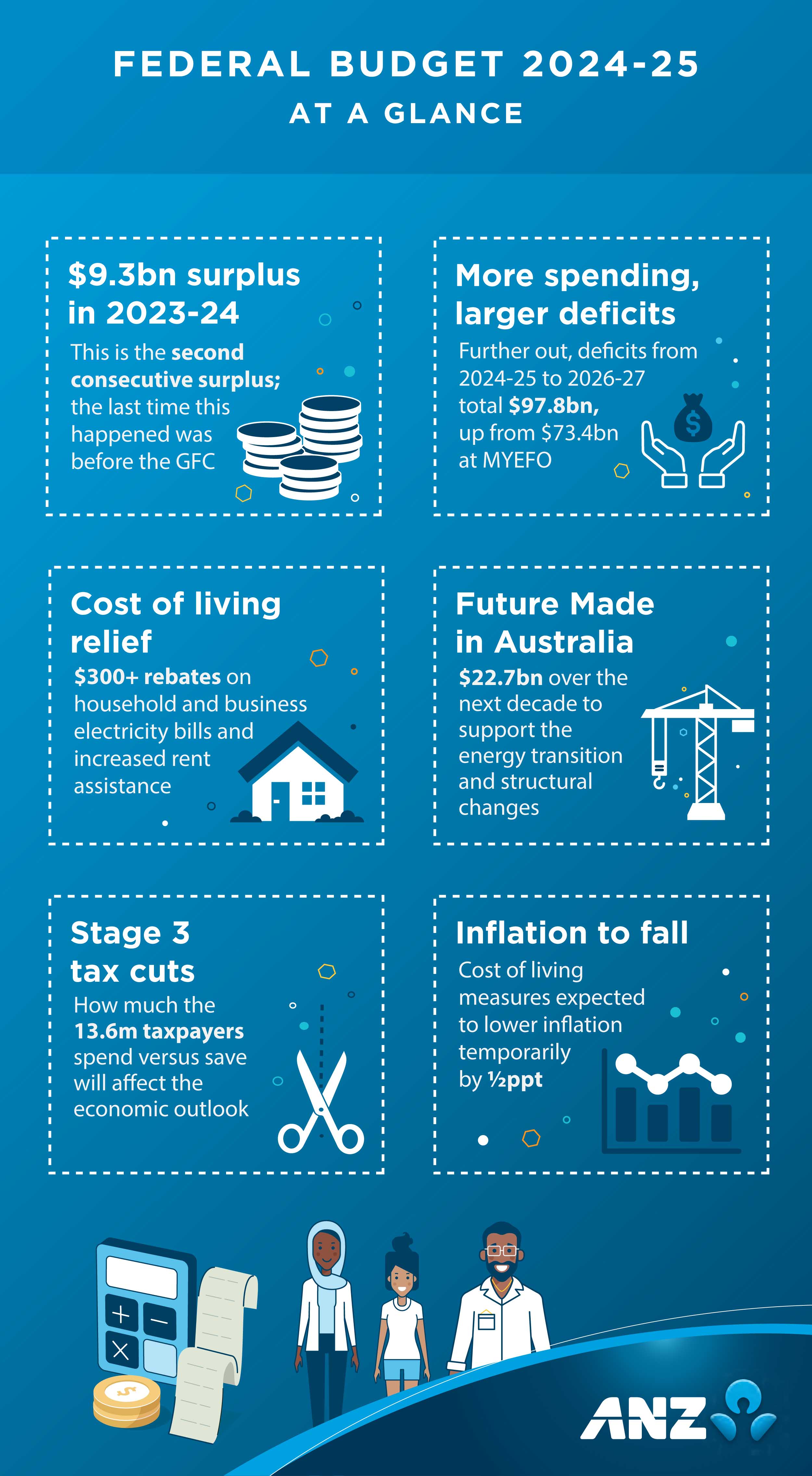 From the return to surplus to cost-of-living relief, see ANZ’s Australian budget coverage in an easy-to-read visual format.