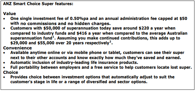 “ANZ Smart Choice Super is more than just a low cost solution. It gives our customers access to quality investment options that can be matched to their life stage, full portability between employers and industry leading life insurance products.