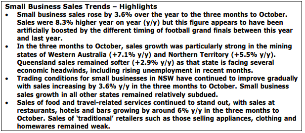 Overall, sales growth among small businesses remained relatively soft, but outperformed in the resources-rich states of Western Australia (WA) and Northern Territory (NT). In other sectors, food and travel-related sales continued to grow strongly while sales of appliances, clothing and homewares remained weak.