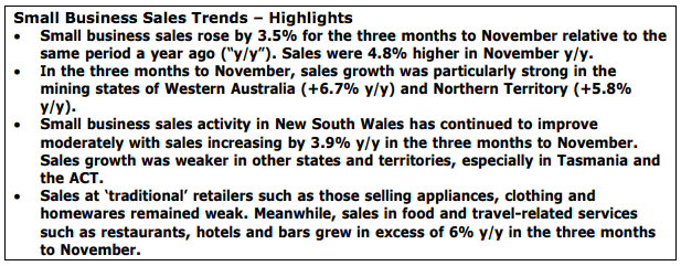 ANZ today released its Small Business Sales Trends report for November which showed that small business sales rose by 4.8% y/y and by 3.5% y/y in the three months to November
